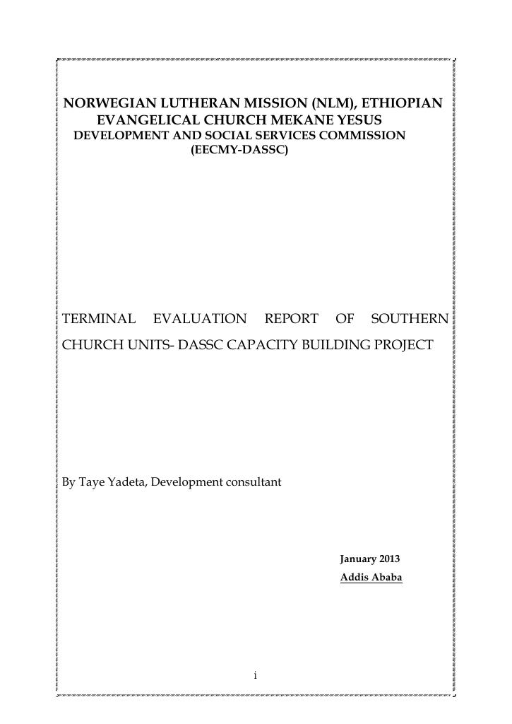 Per the original plan, the final evaluation of SCU-CBP is initiated by the implementing partner EECMY-DASSC. The terms of reference has been designed in cooperation with NLM office in Ethiopia. The evaluation is carried out by Mr. Taye Yadeta, who is a private hired Development Consultant based in Ethiopia. The Capacity Building Project has been in operation since 2005, and currently in its bridging period after the 2nd phase. The partner has applied for extension of the bridging period into 2014 in order to be able to complete the 3rd phase PD to good standard. This terminal evaluation was conducted as a response to an agreement entered between the partners (EECMY-DASSC and NLM). It is aimed at evaluating key results produced by competence building interventions from the analysis of six target southern church units DASSC.