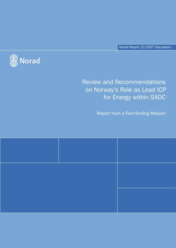 In the Regional Indicative Strategic Development Plan (RISDP) and the Strategic Plan for the Organ (SIPO), SADC and International Co-operating Partners (ICPs) have developed a new partnership between SADC and the ICPs. This Partnership is intended to provide a structure for effective dialogue between SADC and ICPs and to guide future co-operation between SADC and ICPs for the achievement of SADC's socio-economic development agenda. SADC has launched Norway as the lead ICP for the thematic group for the energy sector (ETG). The objectives of the arrangement with a lead ICP of a thematic group is to assist SADC in facilitating coordination of ICPs involved or interested in the given thematic area, and to strategically advise the Secretariat and other SADC structures on ICPs comparative advantages, and individual ICP priorities of support. The main purpose of this review has been to provide advice to the Norwegian Embassy in Maputo on how Norway can fill the role as lead and meet the expectations from SADC and ICPs in this respect.