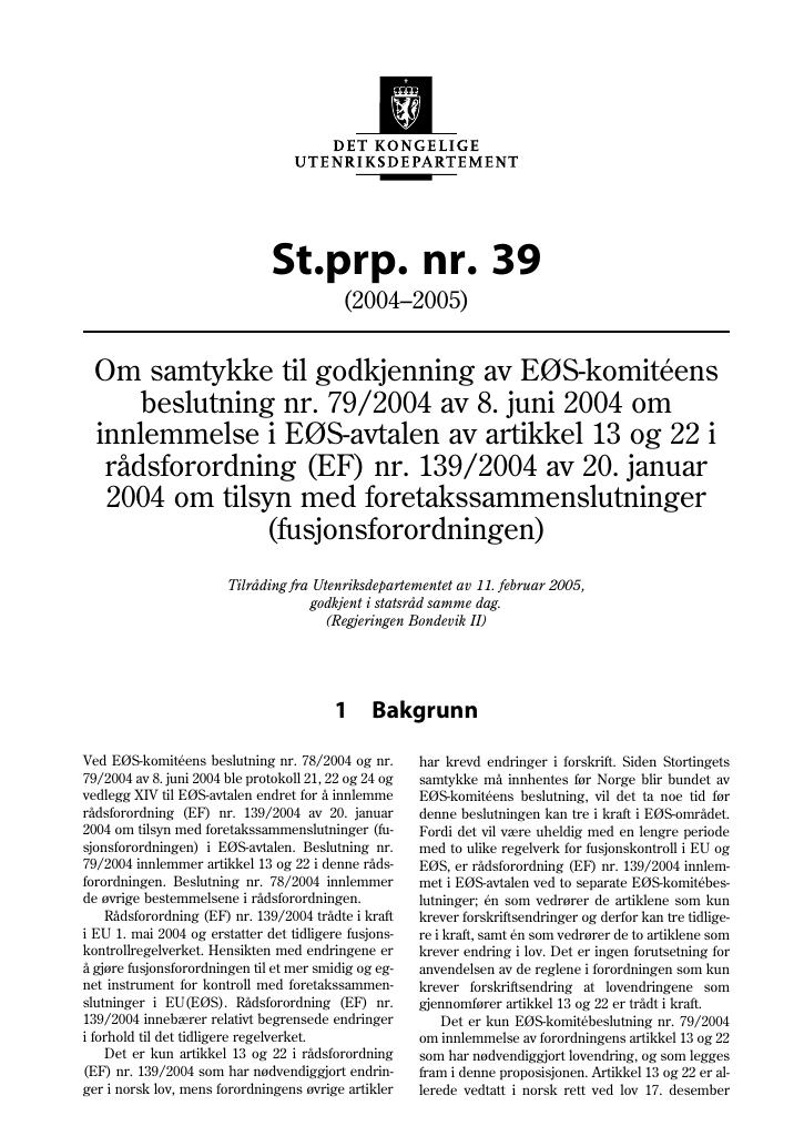 St.prp. nr. 39 (2004-2005) Om samtykke til godkjenning av EØS-komitéens beslutning nr. 79/2004 av 8. juni 2004 om innlemmelse i EØS-avtalen av artikkel 13 og 22 i rådsforordning (EF) nr. 139/2004 av 20. januar 2004 om tilsyn med foretakssammenslutninger (fusjonsforordningen)